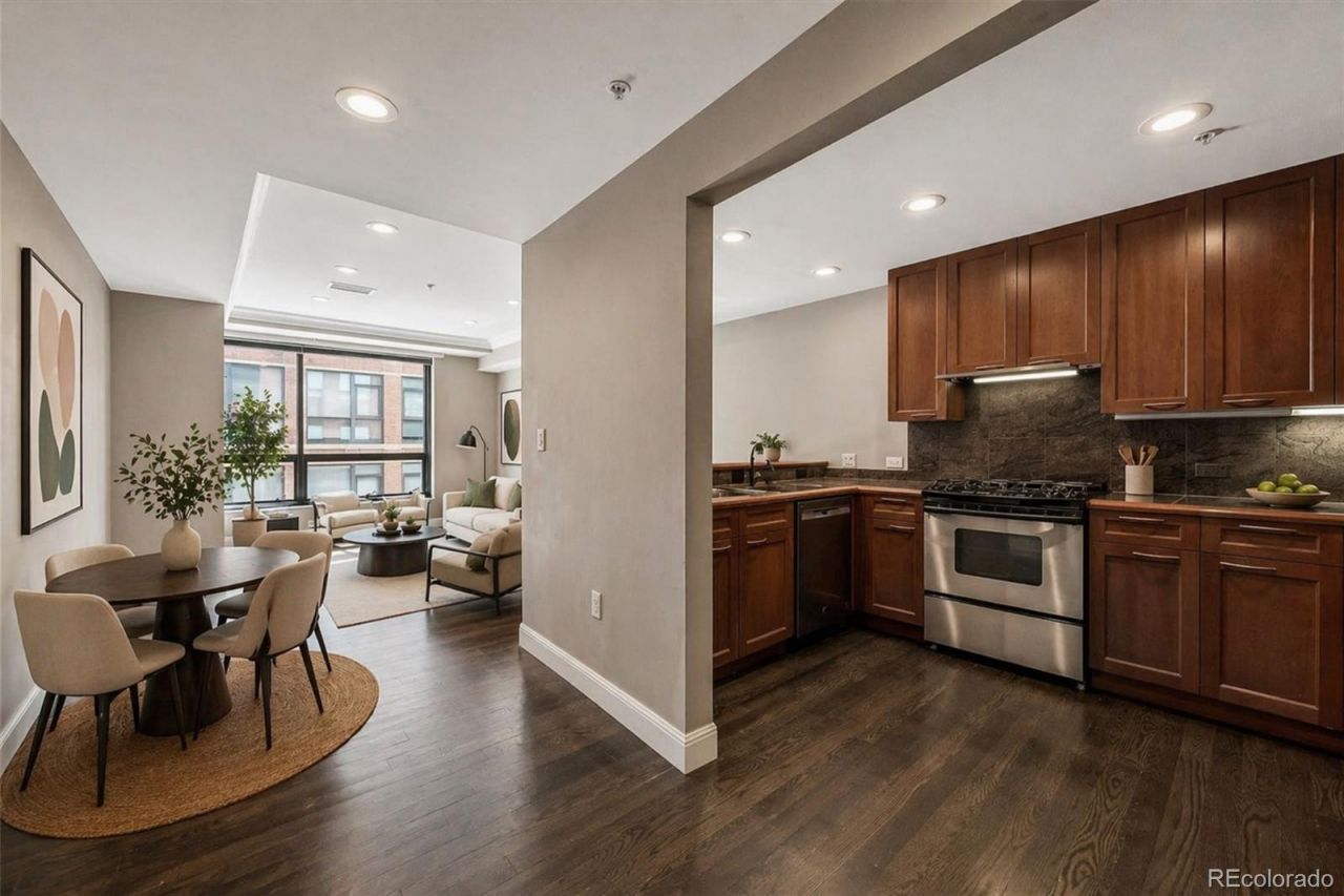 Enter Riverfront Tower and step into this beautifully updated 1 bedroom, 1 bathroom condo. This home offers a seamless blend of style and comfort, featuring rich dark hardwood floors, large windows that fill the space with natural light, and elegant finishes that add a refined touch throughout.The kitchen is equipped with upgraded appliances, creating a functional and modern space for both everyday living and entertaining. The spacious bedroom features two large windows and dual closets, providing abundant natural light and ample storage. The full bathroom is finished with granite tile. This unit comes with a dedicated garage parking space plus additional storage. Enjoy the best of urban living at Riverfront Tower, ideally located just steps from Union Station and Whole Foods, and less than a mile from Coors Field. With the South Platte River and Commons Park right outside your door, this location offers a rare balance of city convenience and peaceful, natural surroundings.